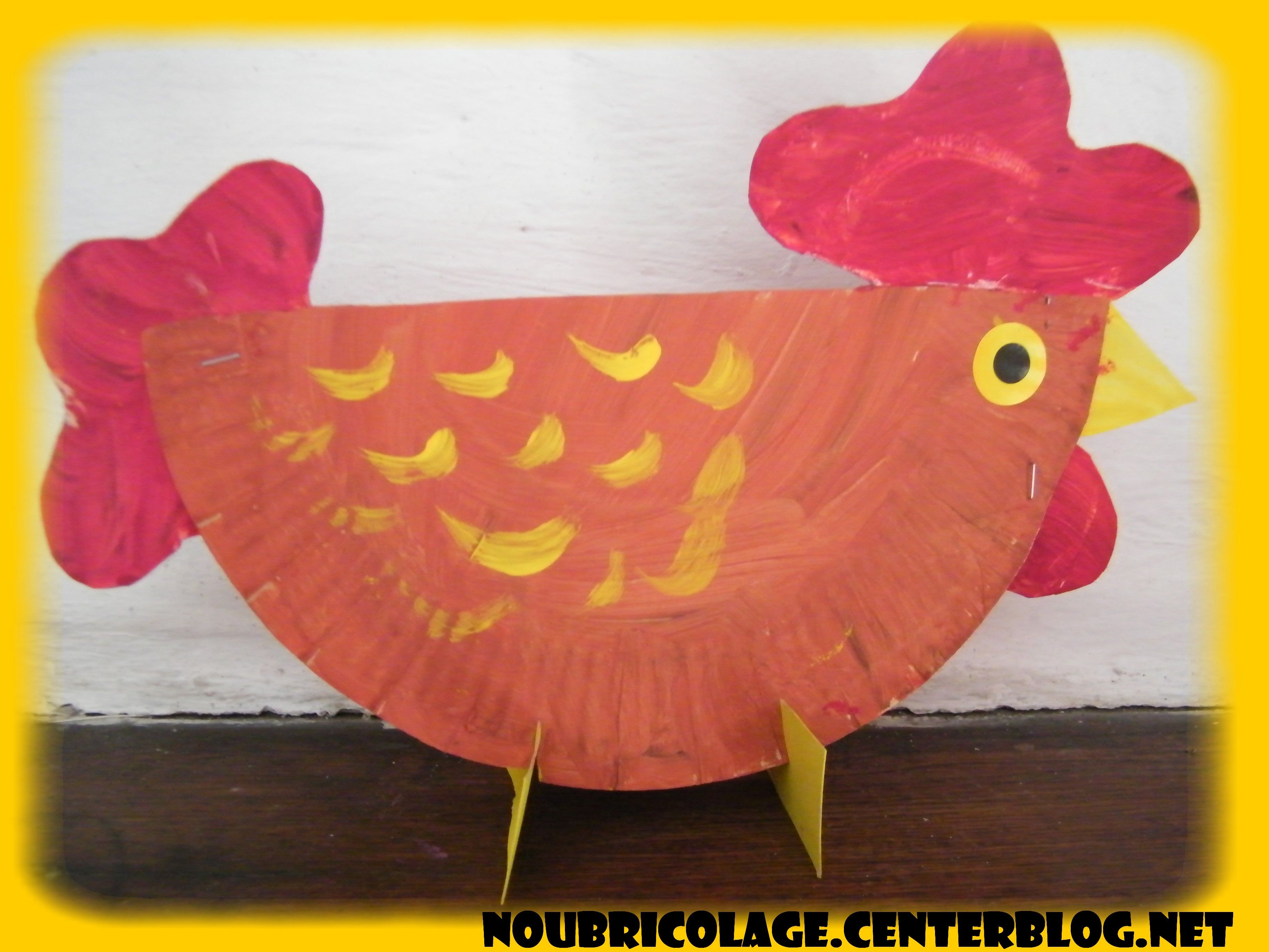 pour réaliser la poule, il faut une assiette en carton pour le corps de la poule, et une feuille cartonnée pour les 2 pattes ainsi que pour le bec et la crête.