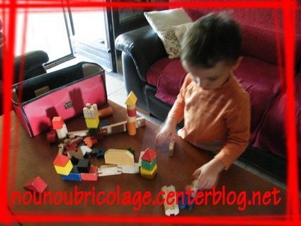 Baptiste (25 mois) joue avec des animaux en bois et des cubes