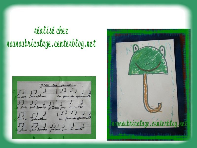 j'ai dessiné un parapluie pour Lucie (3 ans) qui l'a colorié en vert pour illustrer une chansonnette "j'ai un parapluie en peau de grenouille..." que l'on est en train d'étudier vu le temps "magnifique qu'on a à Luriecq!!!